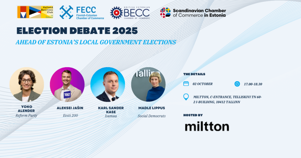 With the Estonian local government elections approaching on 19 October 2025, the Scandinavian Chamber of Commerce in Estonia, together with our member Miltton, is pleased to invite you to an Election Debate on October 2nd. The event is co-organized in cooperation with the Finnish-Estonian Chamber of Commerce (FECC), the British-Estonian Chamber of Commerce (BECC), and the Holland Business Club in Estonia.