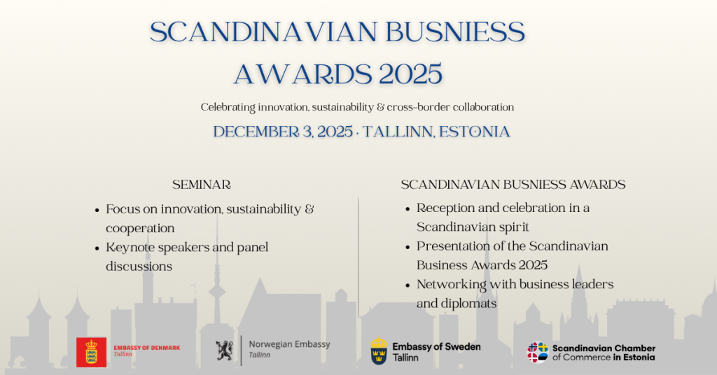 The Scandinavian Chamber of Commerce in Estonia, in cooperation with the Royal Embassies of Denmark, Norway, and Sweden, is pleased to announce the Scandinavian Business Awards 2025.